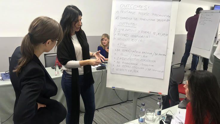 Predstavnici crnogorskog Parlamenta rade na definisanju ključnih indikatora performansi na obuci koju je organizovala Misija OEBS-a u Crnoj Gori, u cilju poboljšanja kapaciteta skupštinskih službi i unapređenja znanja iz sistema modernog upravljanja poslovanjem, Podgorica, 20. novembar 2018.