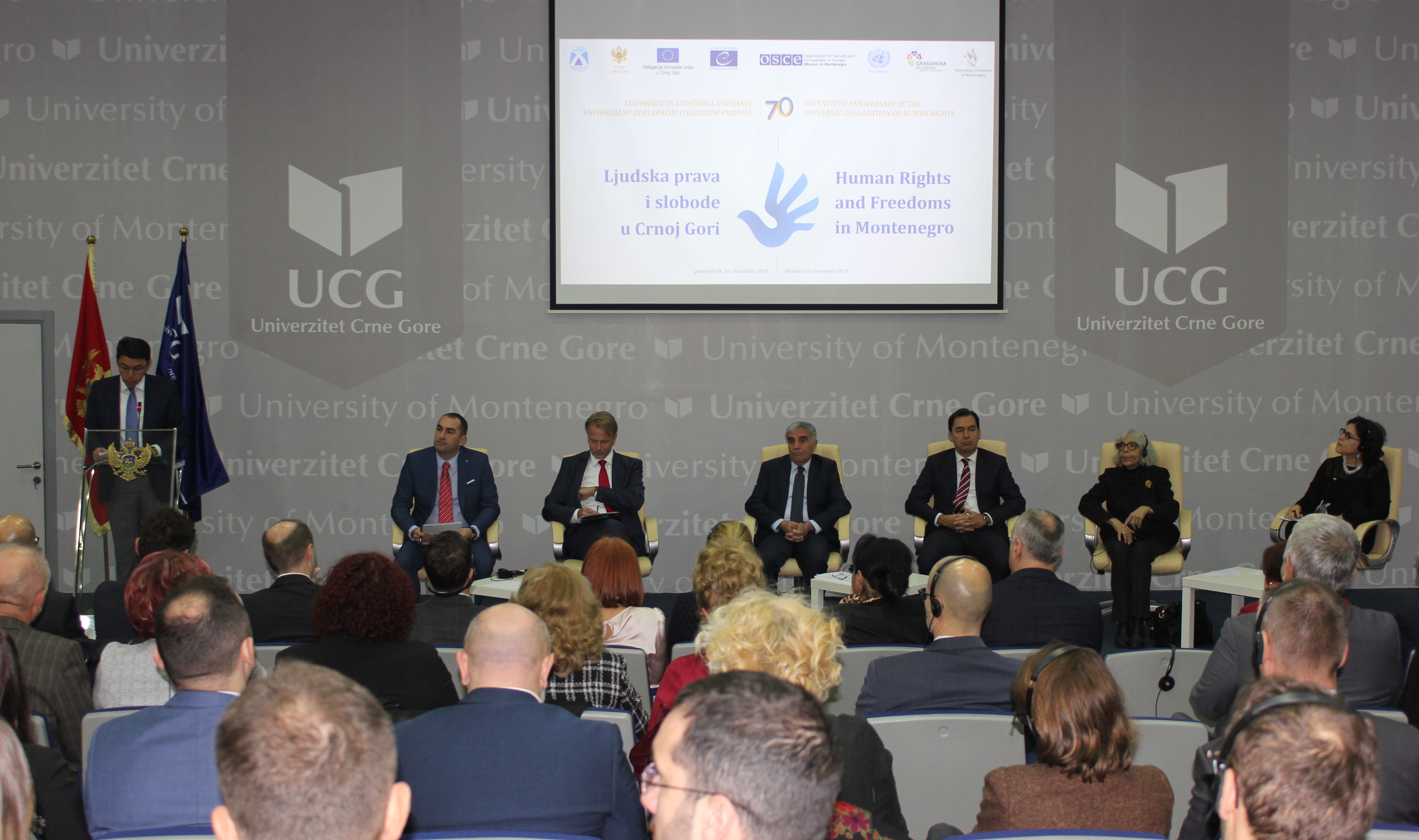 Predsjednik Udruženja pravnika Branislav Radulović otvara konferenciju posvećenu ljudskim pravima i slobodama u Crnoj Gori, na kojoj su, takođe, učestvovali: (l-d) predstavnik NVO Građanska alijansa Milan Radović, šef Delegacije EU u Crnoj Gori Aivo Orav, zaštitnik ljudskih prava i sloboda Šućko Baković, potpredsjednik Vlade Crne Gore i ministar pravde Zoran Pažin, šefica Misije OEBS-a u Crnoj Gori Maryse Daviet i vršilac dužnosti koordinatorke Sistema UN u Crnoj Gori i stalna predstavnica UNHCR-a Roberta Montevecchi. Podgorica, Crna Gora, 10. decembar 2018. godine.