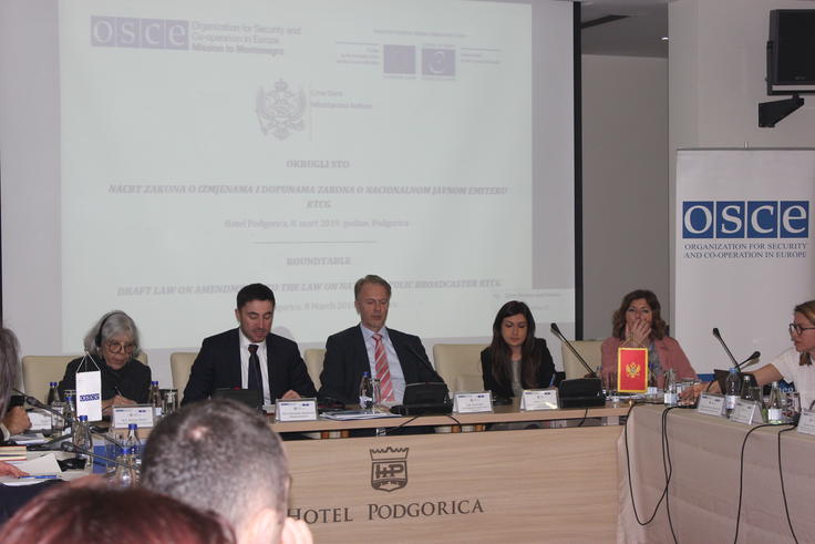 (l-d) Šefica Misije OEBS-a u Crnoj Gori Maryse Daviet, crnogorski ministar kulture Aleksandar Bogdanović, šef Delegacije i ambasador EU u Crnoj Gori Aivo Orav i šefica Programske kancelarije Savjeta Evrope u Podgorici Angela Longo na otvaranju javne rasprave o Nacrtu Zakona o izmjenama i dopunama Zakona o nacionalnom emiteru Radio-televizije Crne Gore (RTCG) u Podgorici, Crna Gora, 8. mart 2019. godine.