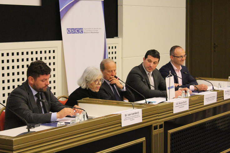 Šefica Misije OEBS-a u Crnoj Gori Maryse Daviet, zajedno sa (l-d) generalnim direktorom za multilateralne poslove u Ministarstvu vanjskih poslova Ivanom Ivaniševićem, bivšim generalnim sekretarom Jadransko-jonske inicijative i višim savjetnikom, ambasadorom Fabiom Pigliapocom, ministrom sporta i mladih u Vladi Crne Gore Nikolom Janovićem i generalnim direktorom Direkcije za mlade u Ministarstvu sporta Nenadom Koprivica, otvara "Konferenciju o jačanju regionalne i jadransko-jonske saradnje u oblasti mladih", Budva, Crna Gora, 5. april 2019. godine.