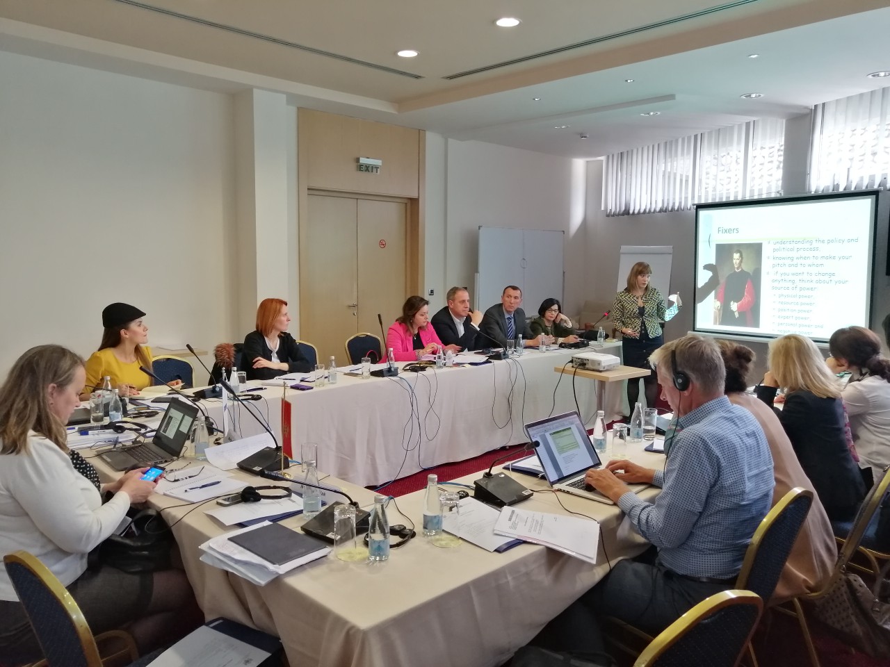 Ekspertkinja za rodnu ravnopravnost Maria Risteska sa učesnicima OEBS-ove radionice na temu značaja uvođenja rodno odgovornog budžetiranja u državni budžet, Podgorica, Crna Gora, 14. maj 2019. godine.
