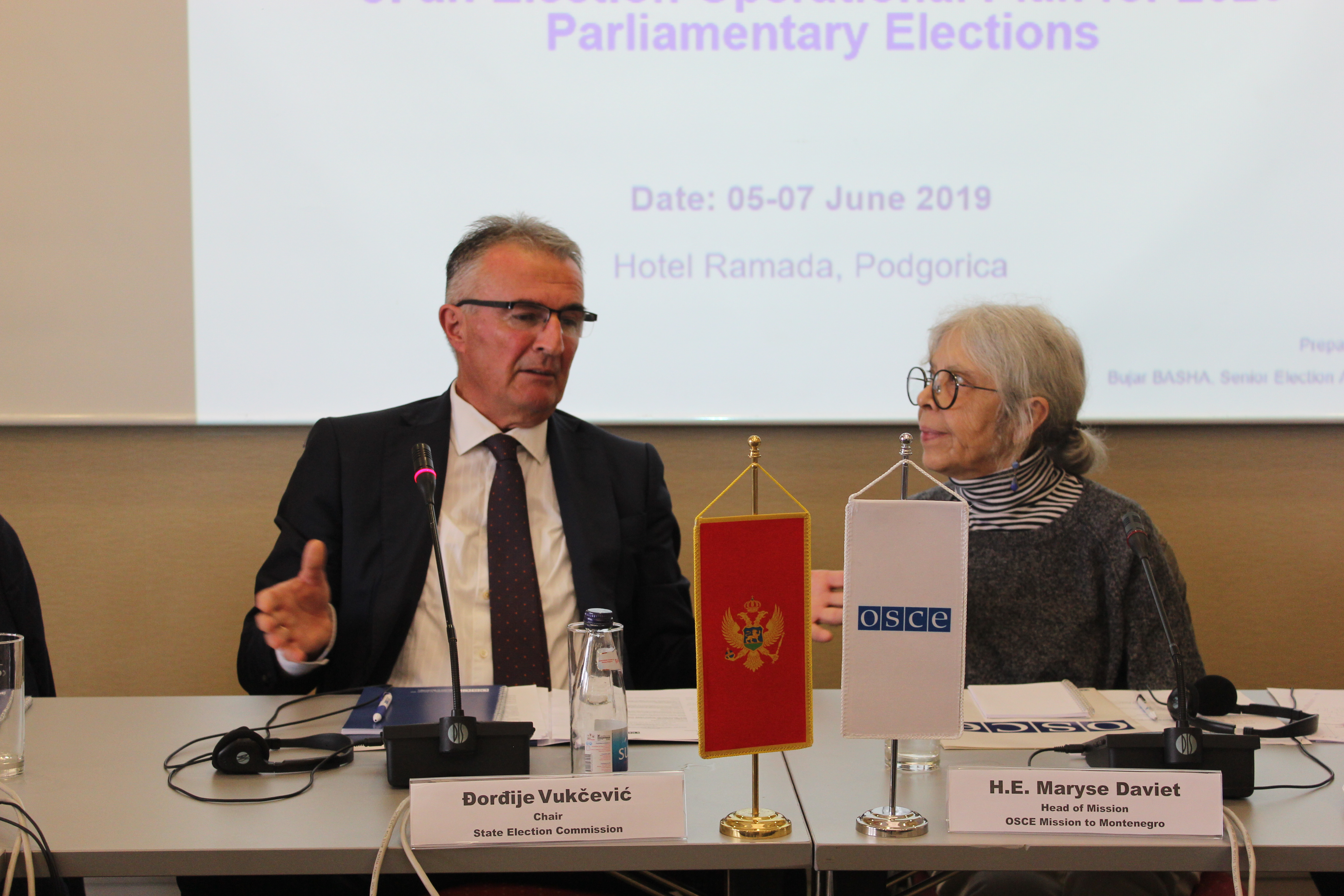 Šefica Misije OEBS-a u Crnoj Gori Maryse Daviet i predsjednik Državne izborne komisije (DIK) Đorđije Vukčević otvaraju trodnevni seminar za članove DIK-a na temu izrade izbornog operativnog plana u Podgorici, Crna Gora, od 5. do 7. juna 2019. godine.