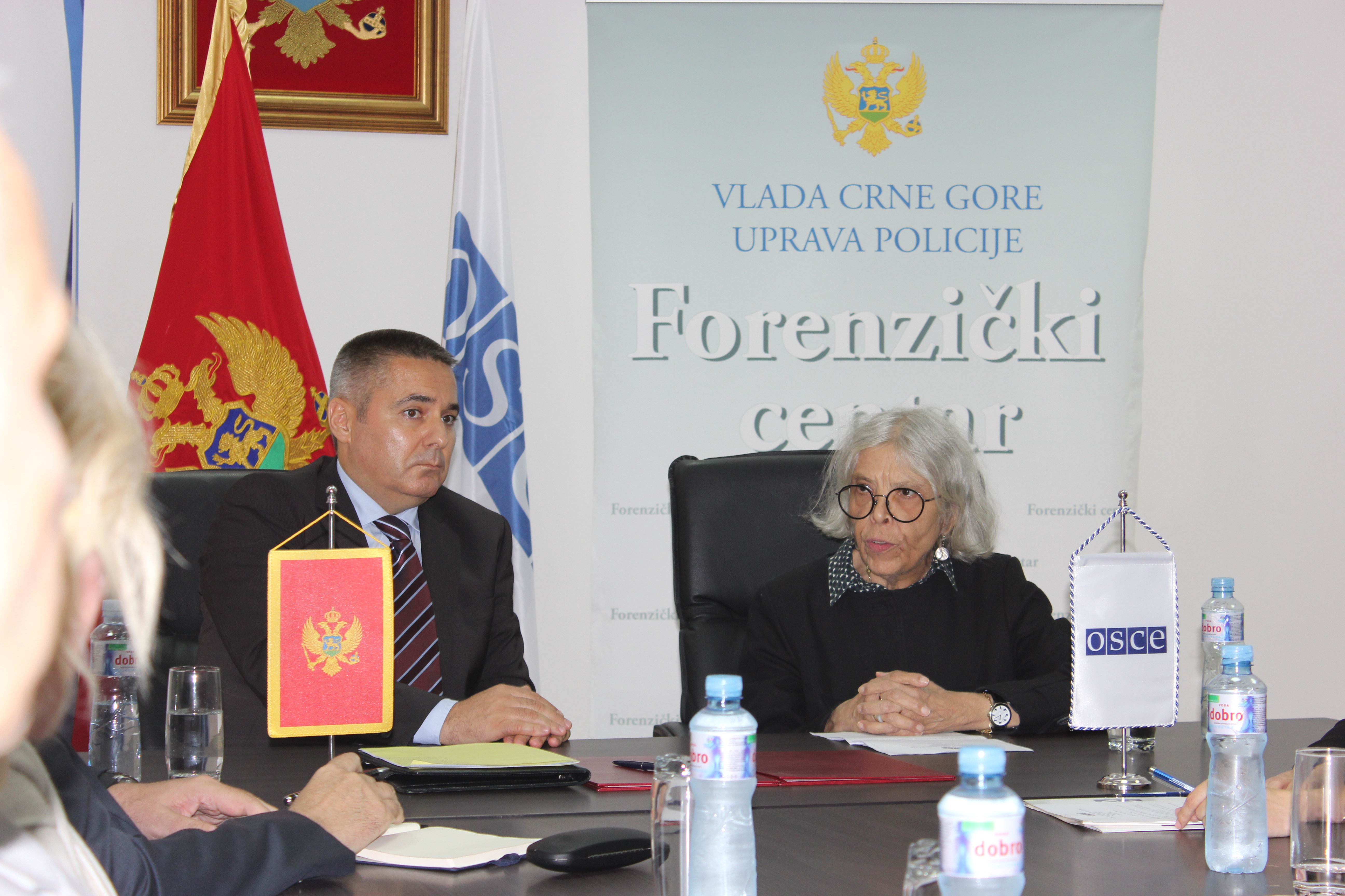 Šefica Misije OEBS-a u Crnoj Gori Maryse Daviet i direktor Uprave policije Crne Gore Veselin Veljović govore nakon potpisivanja Ugovora o donaciji forenzičke opreme nacionalnom Forenzičkom centru u Danilovgradu, 11. septembra 2019. godine.