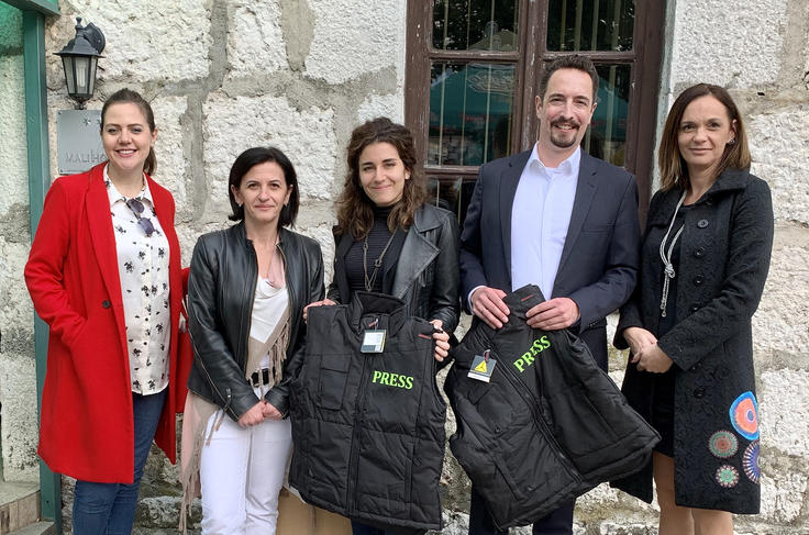 Menadžer medijskog programa Misije OEBS-a u Crnoj Gori Daniel Blank i njegov tim predali su posljednji paket prsluka i jakni sa oznakom „PRESS“ Ivani Jabučanin, V.D. direktorici i glavnoj urednici (d) lokalnog javnog emitera na Cetinju 30. oktobra 2019. godine.