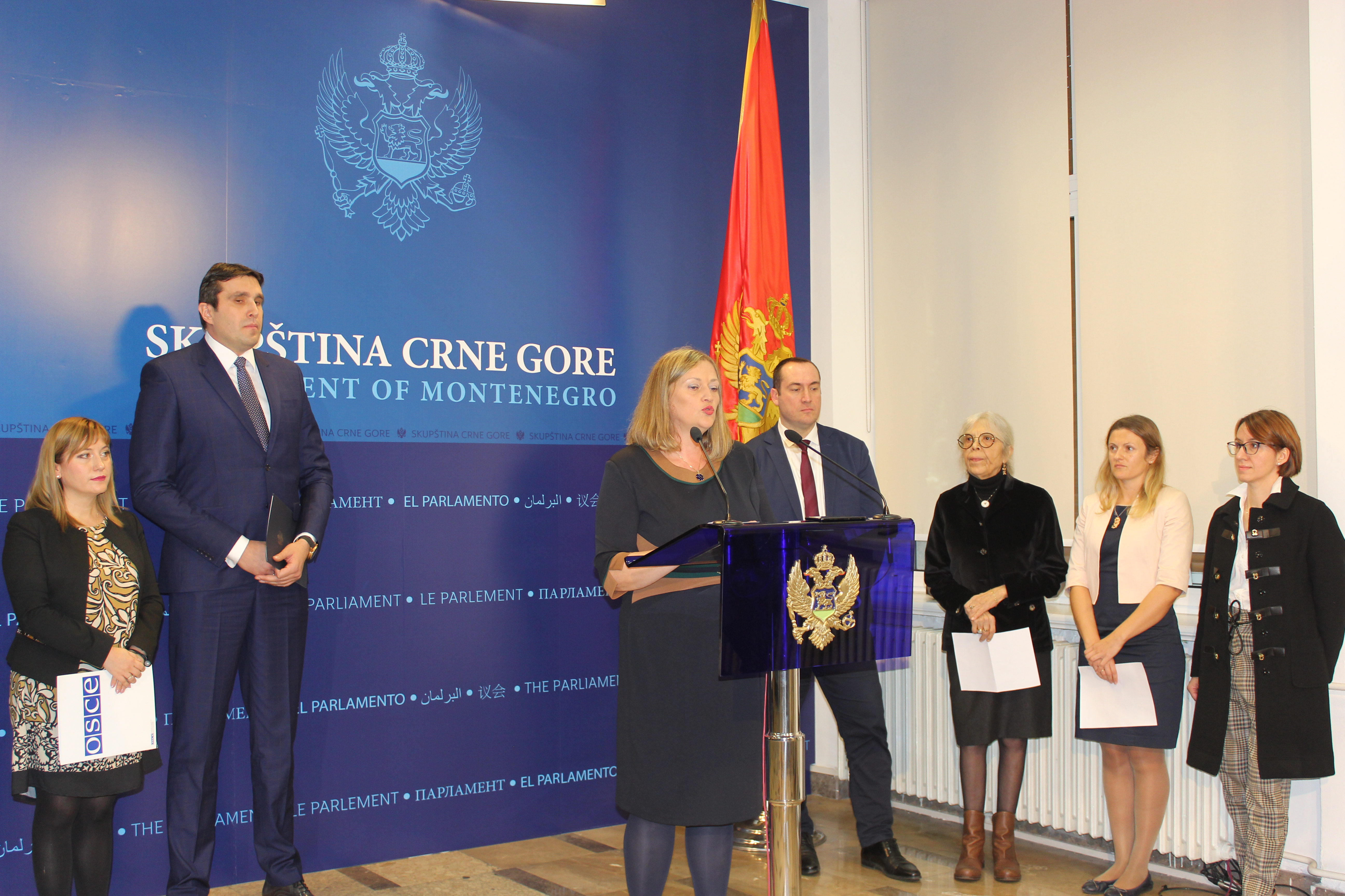 (l-d) Ekspertkinja za rodnu ravnopravnost Marija Risteska, državni sekretar Ministarstva poljoprivrede i ruralnog razvoja Đuro Žugić, predsjednica Odbora za rodnu ravnopravsnost Nada Drobnjak, generalni direktor direktorata za državni budžet u Ministarstvu finansija Bojan Paunović i šefica misije OEBS-a u Crnoj Gori Maryse Deviet najavili su namjeru Vlade da u narednom ciklusu agro budžeta u okviru Ministarstva poljoprivrede i ruralnog razvoja sprovedu rodno odgovorno budžetiranje. Podgorica, 26. novembar 2019. godine.