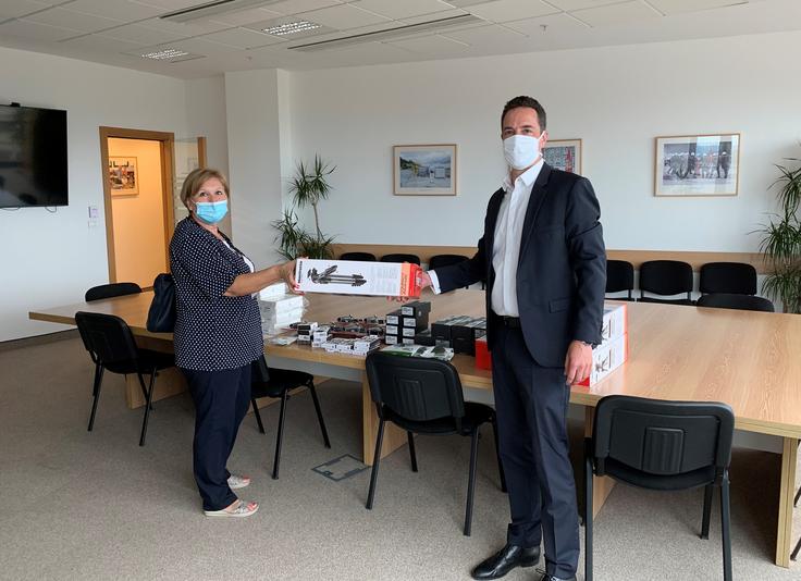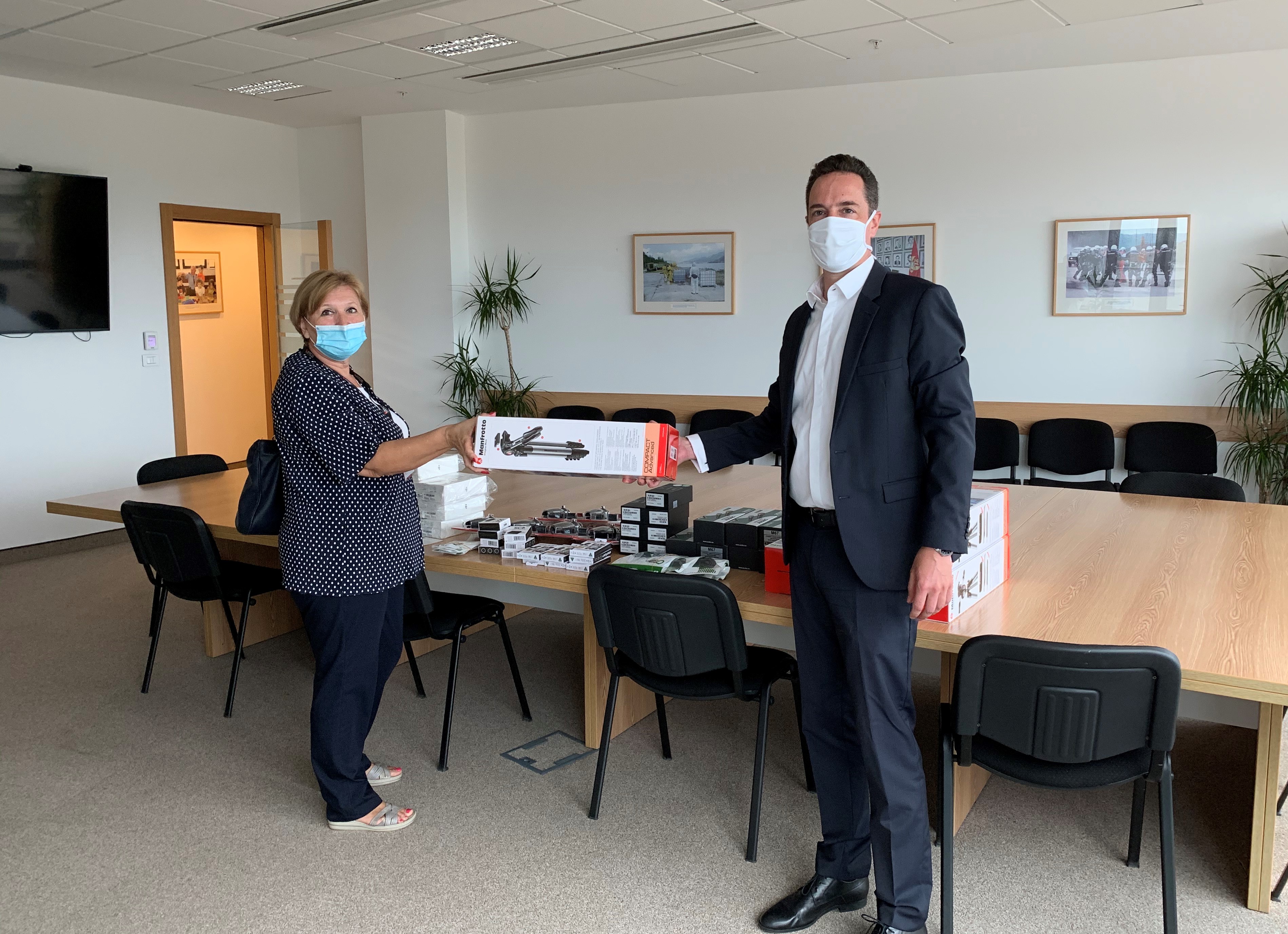 Menadžer Programa za medije u Misiji OEBS-a u Crnoj Gori, Daniel Blank, predao je sedam novih i najsavremenijih mobilnih novinarskih kompleta Nadi Obrenović, službenici za komercijalne i javne nabavke u nacionalnom Javnom servisu, Radio-televiziji Crne Gore (RTCG) u Podgorici, 6. avgusta 2020. godine.