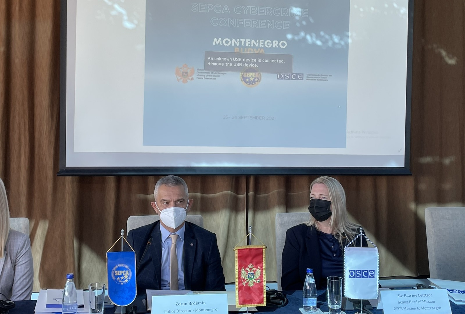 Vršiteljka dužnosti šefice Misije OEBS-a u Crnoj Gori Siv-Katrine Leirtroe i direktor crnogorske Uprave policije Zoran Brđanin otvorili dvodnevnu konferenciju u organizaciji Asocijacije šefova policija zemalja Jugoistočne Evrope (SEPCA) u Budvi, 23. septembar 2021. godine.