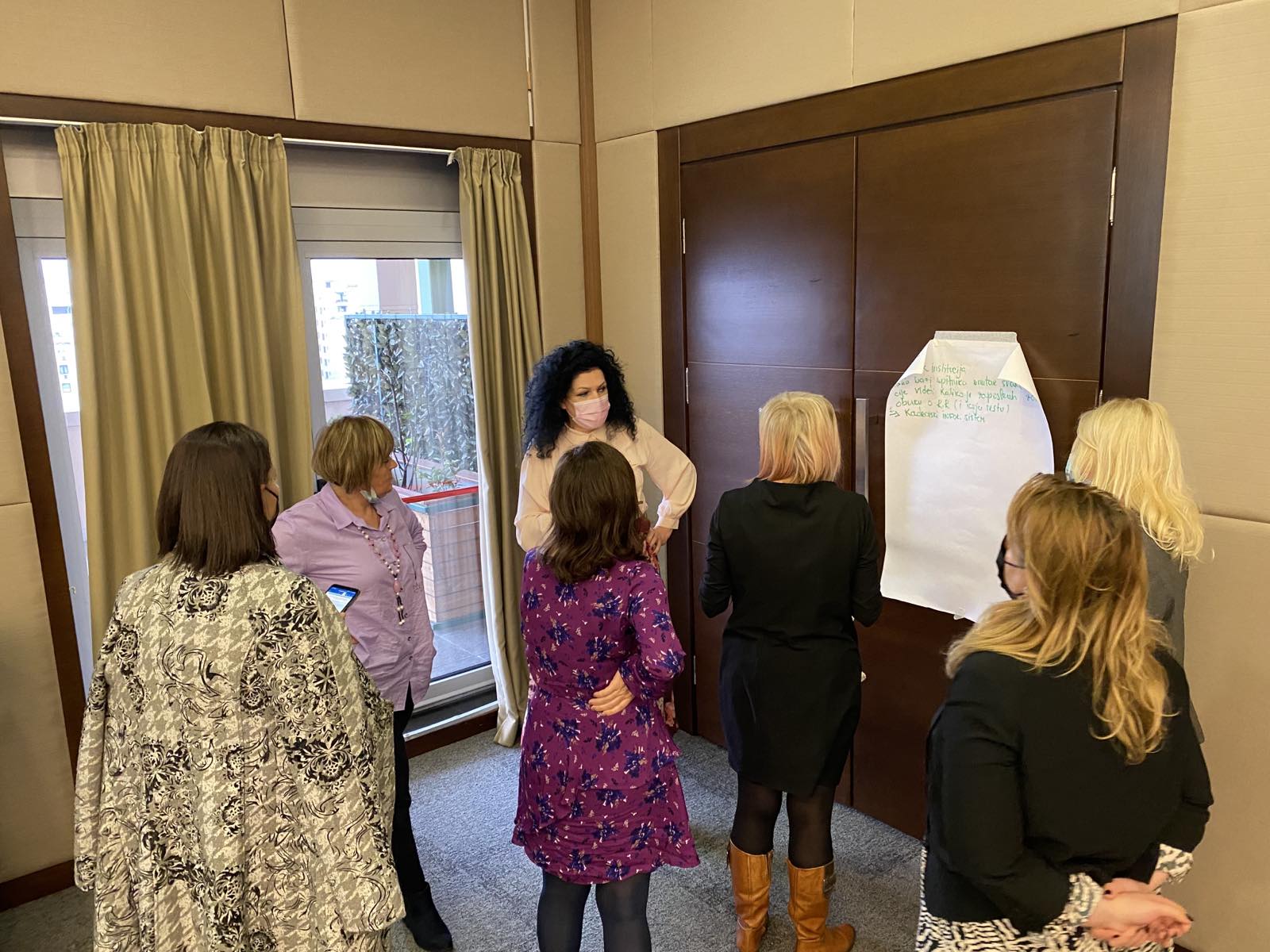 Članovi komisije za praćenje implementacije Nacionalne strategije za rodnu ravnopravnost Crne Gore razgovaraju o tome kako da unaprijede svoje kapacitete, u okviru radionica koje je organizovala Misija OEBS-a u Crnoj Gori u Podgorici, 17. novembar 2021. godine.