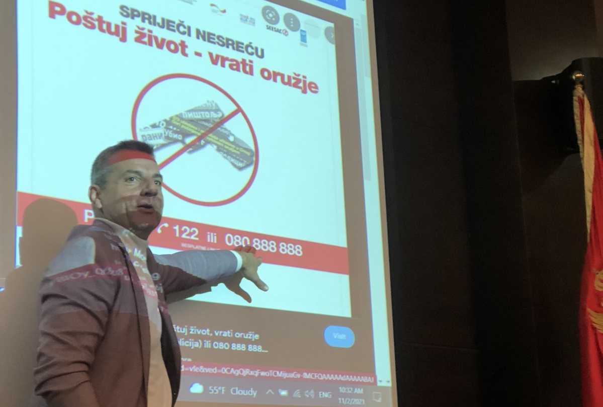 Glavni policijski inspektor za javni red i mir i predsjednik crnogorske Komisije za malo oružje i lako naoružanje, Mladen Marković, govori o iskustvima prethodne kampanje o podizanju svijesti o opasnostima zloupotrebe i širenja malokalibarskog i lakog naoružanja, Podgorica, 2. novembar 2021. godine.