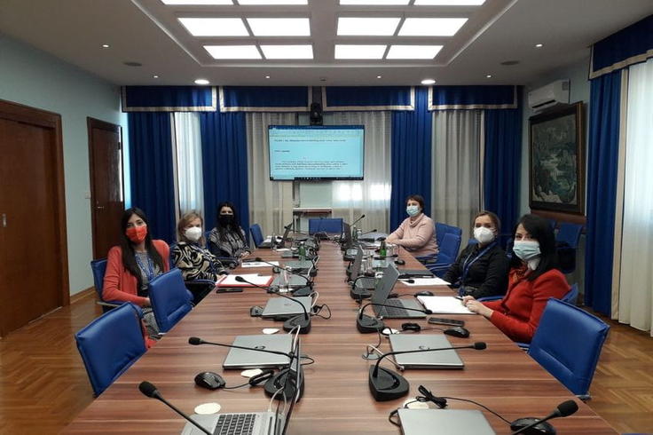 (l) Šefica Bibliotečko-dokumentacionog centra i arhive Skupštine Crne Gore Jelisaveta Blagojević, njene koleginice i (d-c) lokalna ekspertkinja za kreiranje bibliotečkih zapisa, koju je angažovala Misija OEBS-a u Crnoj Gori, Nikoleta Kovačević, pripremaju servis za automatizovanu pozajmicu publikacija iz bibliotečkog fonda, Podgorica, 17. januar 2022. godine.