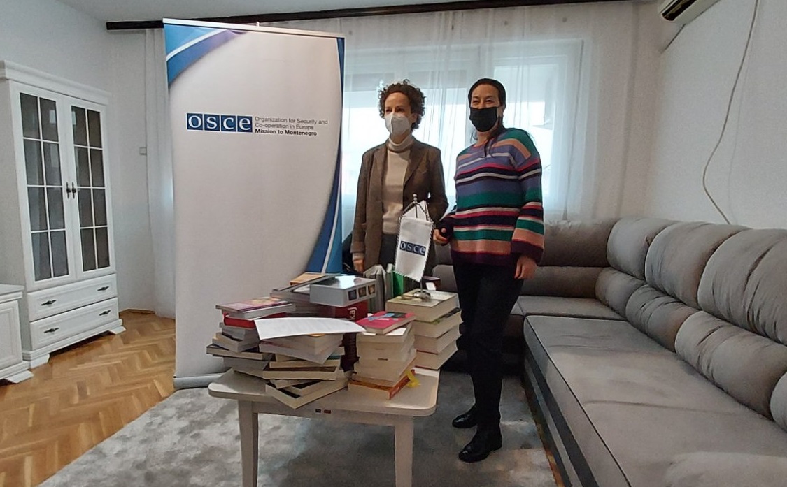 (l-d) Šefica Misije OEBS-a u Crnoj Gori Dominique Waag uručuje direktorici NVO „SOS Podgorica“ Biljani Zeković knjige i komplete za umjetnost i zanat za djecu i mlade koji su preživjeli rodno zasnovano nasilje, u Podgorici, 22. februara 2022. godine.