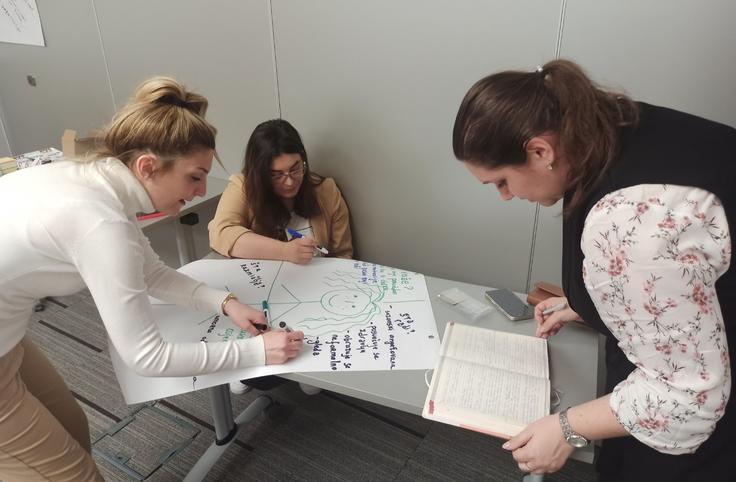 Učesnice treninga o izgradnji kapaciteta lokalnih omladinskih službi, u organizaciji Misije OEBS-a u Crnoj Gori, razgovaraju o alatima i tehnikama mobilizacije zajednice, Podgorica, 18. mart 2022. godine.