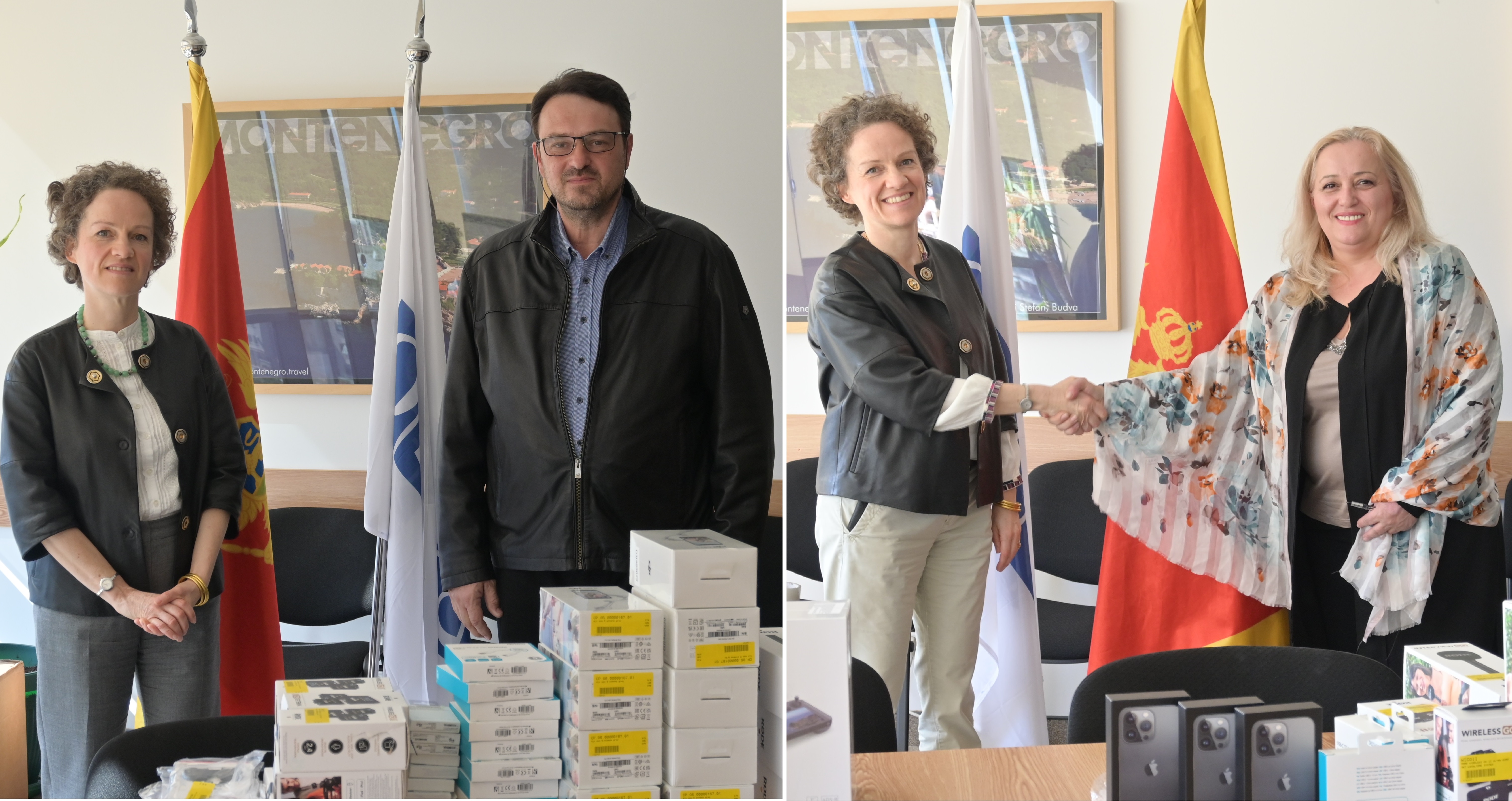 Šefica Misije OEBS-a Crnoj Gori Dominique Waag (l) uručuje mobilnu novinarsku opremu izvršnom direktoru i uredniku dnevnog lista Dan Mladenu Milutinoviću i izvršnoj direktorici NVO Kontekst i direktorici i glavnoj i odgovornoj urednici istraživačkog portala Libertas press, Oliveri Lakić, Podgorica, Crna Gora, 12. i 15. aprila 2022. godine.