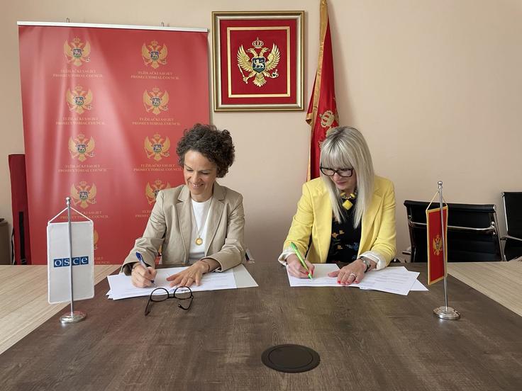 (l-d) Šefica Misije OEBS-a u Crnoj Gori Dominique Waag i vršiteljka dužnosti Vrhovnog državnog tužioca Maja Jovanović potpisale su Memorandum o razumijevanju, Podgorica, 16. juna 2022. godine.