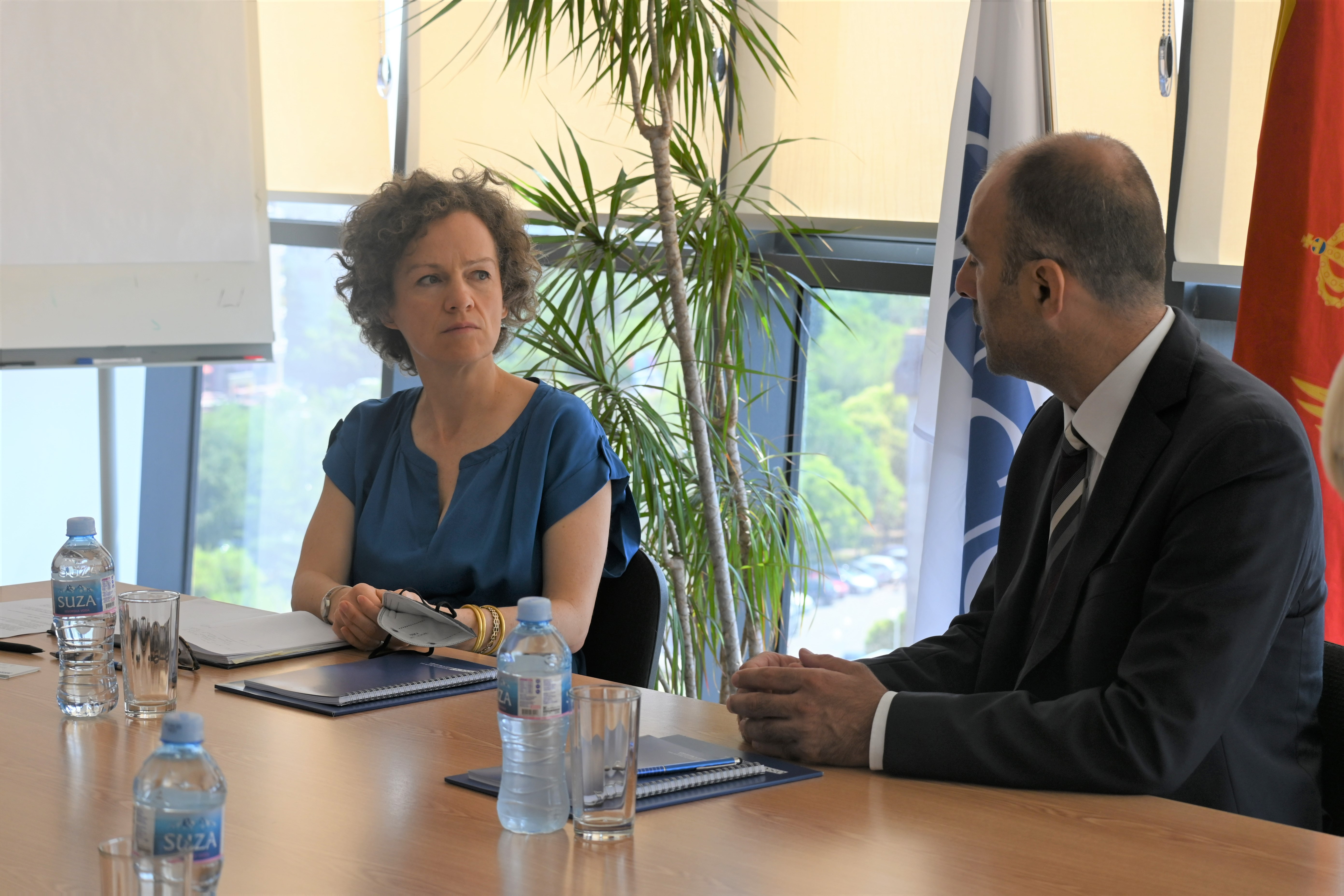 Šefica Misije OEBS-a u Crnoj Gori Dominique Waag i generalni direktor nacionalnog Javnog servisa – Radio Televizije Crne Gore (RTCG) Boris Raonić tokom sastanka na kojem su predstavljeni nalazi istraživanja „Istraživanje snage brenda RTCG“, koje je naručila Misija, a sprovela agencija Damar, Podgorica, 5. jula 2022. godine.