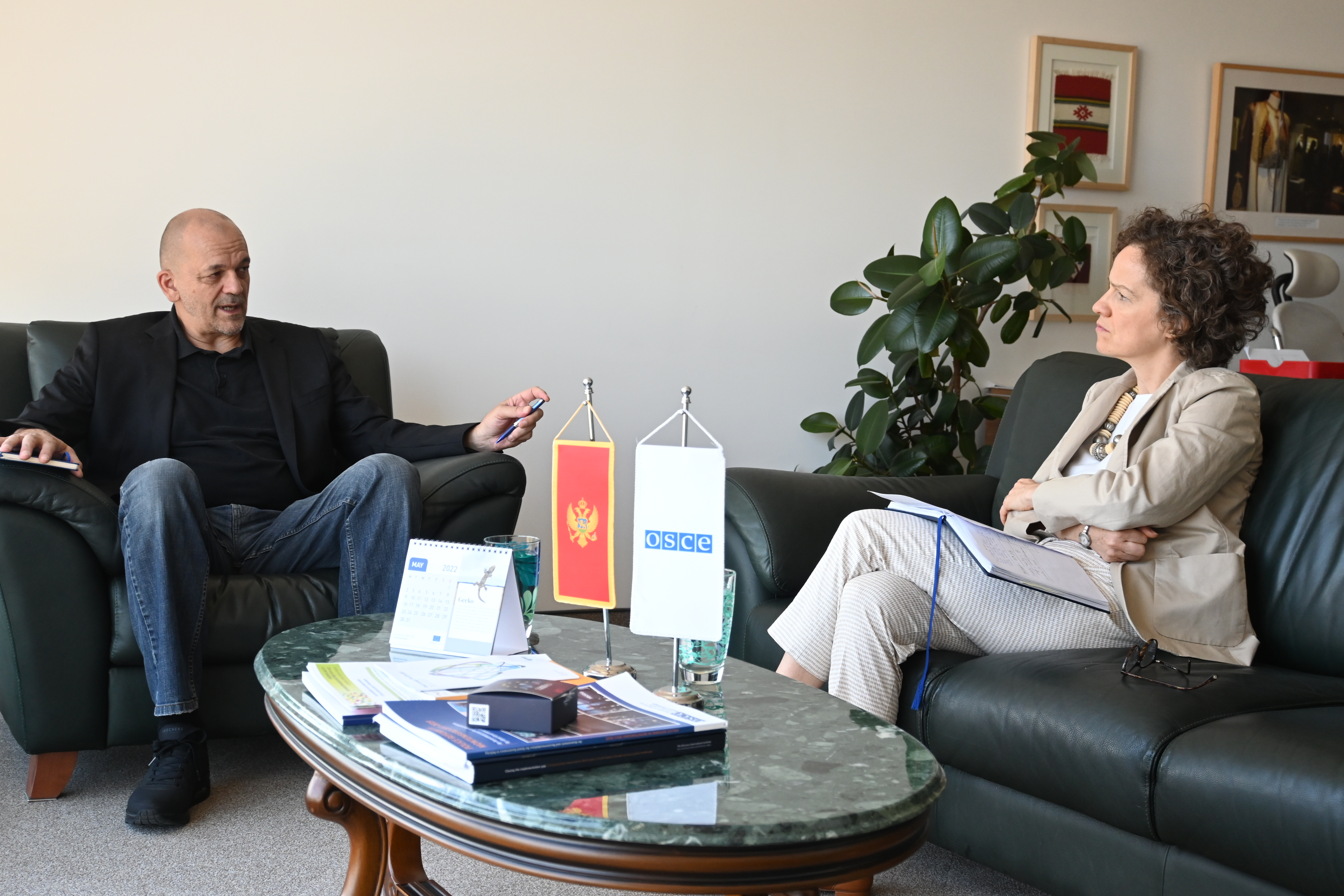 Šefica Misije OEBS-a u Crnoj Gori Dominique Waag na sastanku sa predsjednikom Komisije za praćenje postupanja nadležnih organa u istragama slučajeva prijetnji i nasilja nad novinarima, ubistava novinara i napada na imovinu medija, Mihailom Jovovićem, Podgorica, 11. jul 2022. godine.