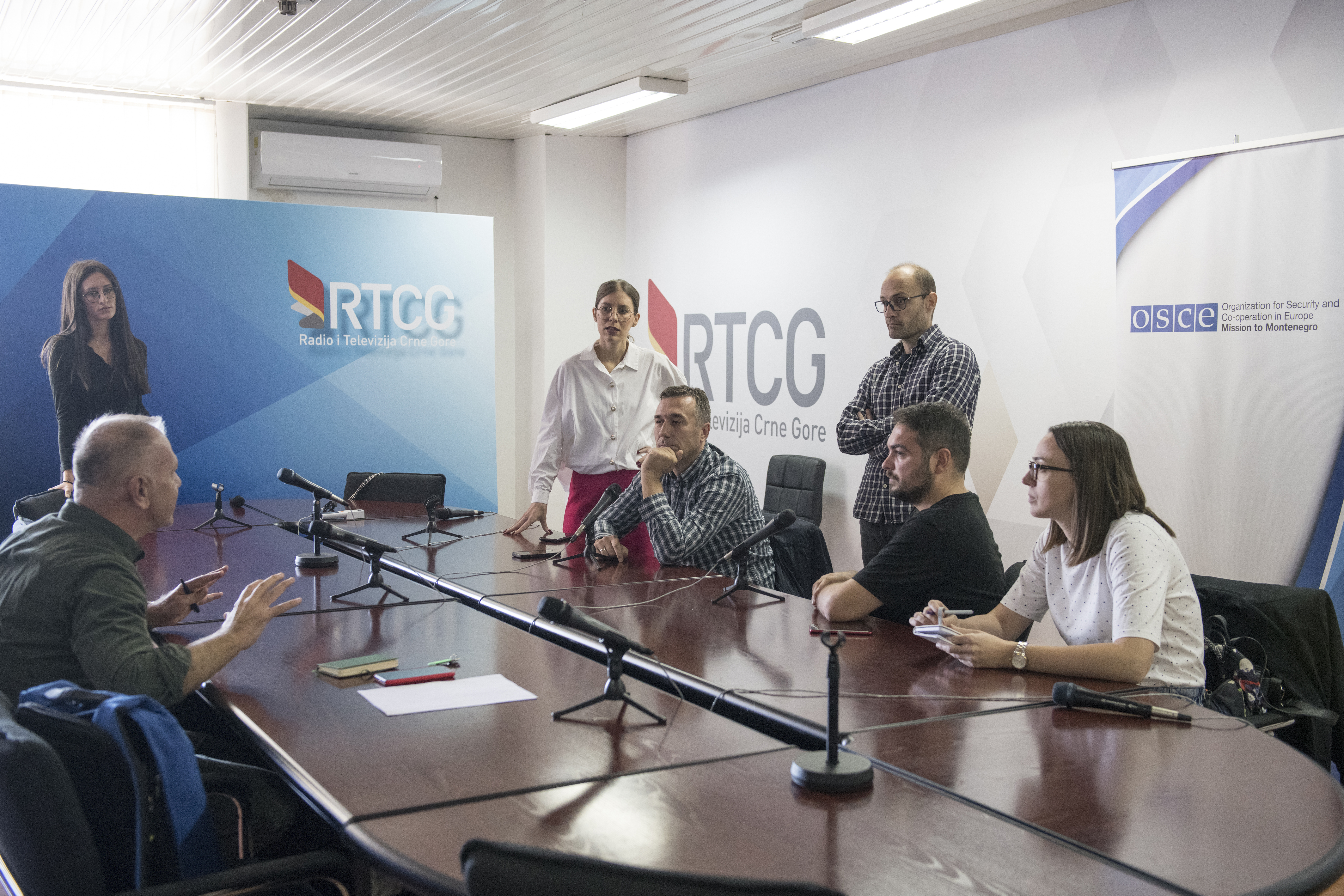 Novinari i novinarke nacionalnog javnog servisa – Radio Televizije Crne Gore (RTCG) tokom drugog kruga obuke na temu izvještavanja uživo u vanrednim situacijama, u organizaciji Misije OEBS-a u Crnoj Gori, Podgorica, 5. oktobar 2022. godine.