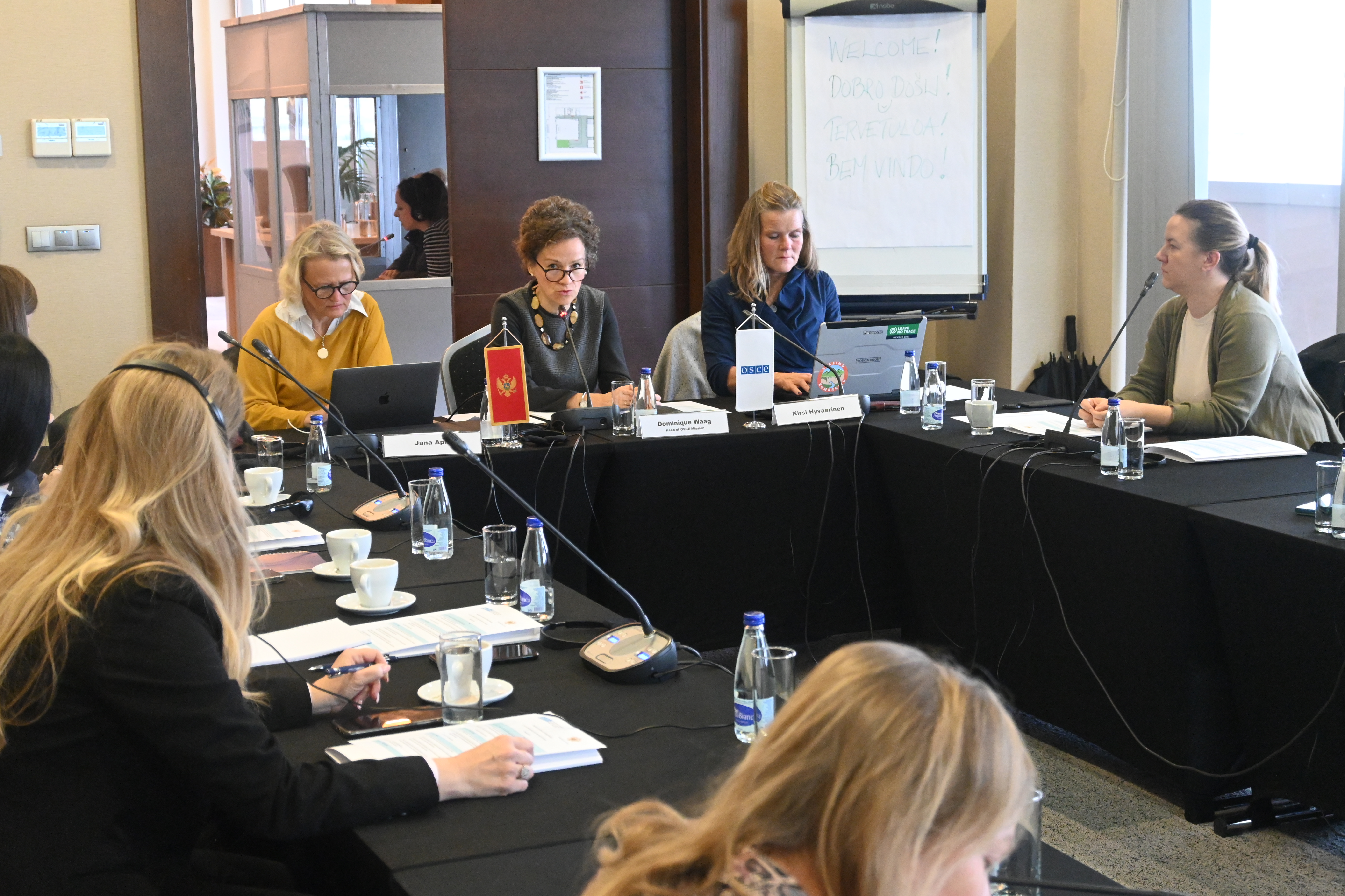 (c) Šefica Misije OEBS-a u Crnoj Gori, Dominique Waag, sa dvije međunarodne ekspertkinje za održivi razvoj, (l) Jana Apih i (d) Kirsi Hivaerinen, otvara dvodnevnu radionicu na temu zaštite životne sredine za zaposlene u sstručnoj službi Skupštine, Podgorica, 22. novembar 2022. godine.