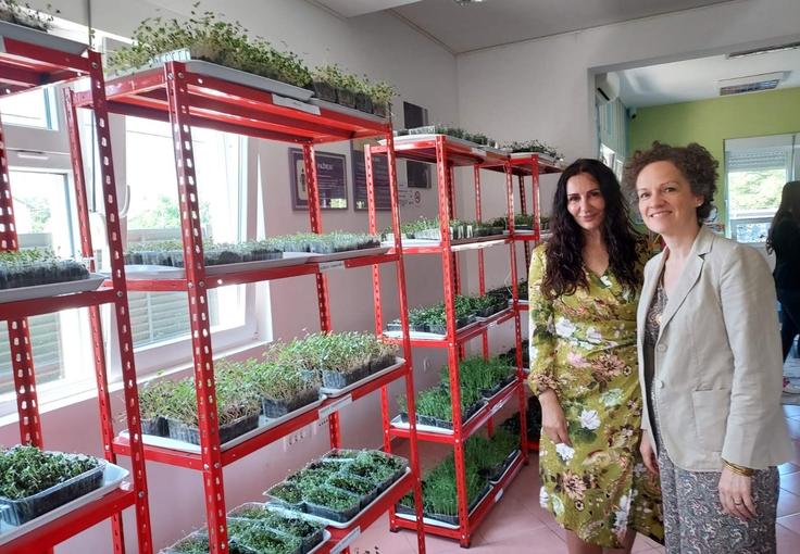 (d) Šefica Misije OEBS-a u Crnoj Gori Dominique Waag i izvršna direktorica NVO SOS Telefon za žene i djecu žrtve nasilja – Nikšić, Nataša Međedović, u obilasku uzgajanog mikrobilja u okviru skloništa, Nikšić, Crna Gora, 26. jun 2023. godine.