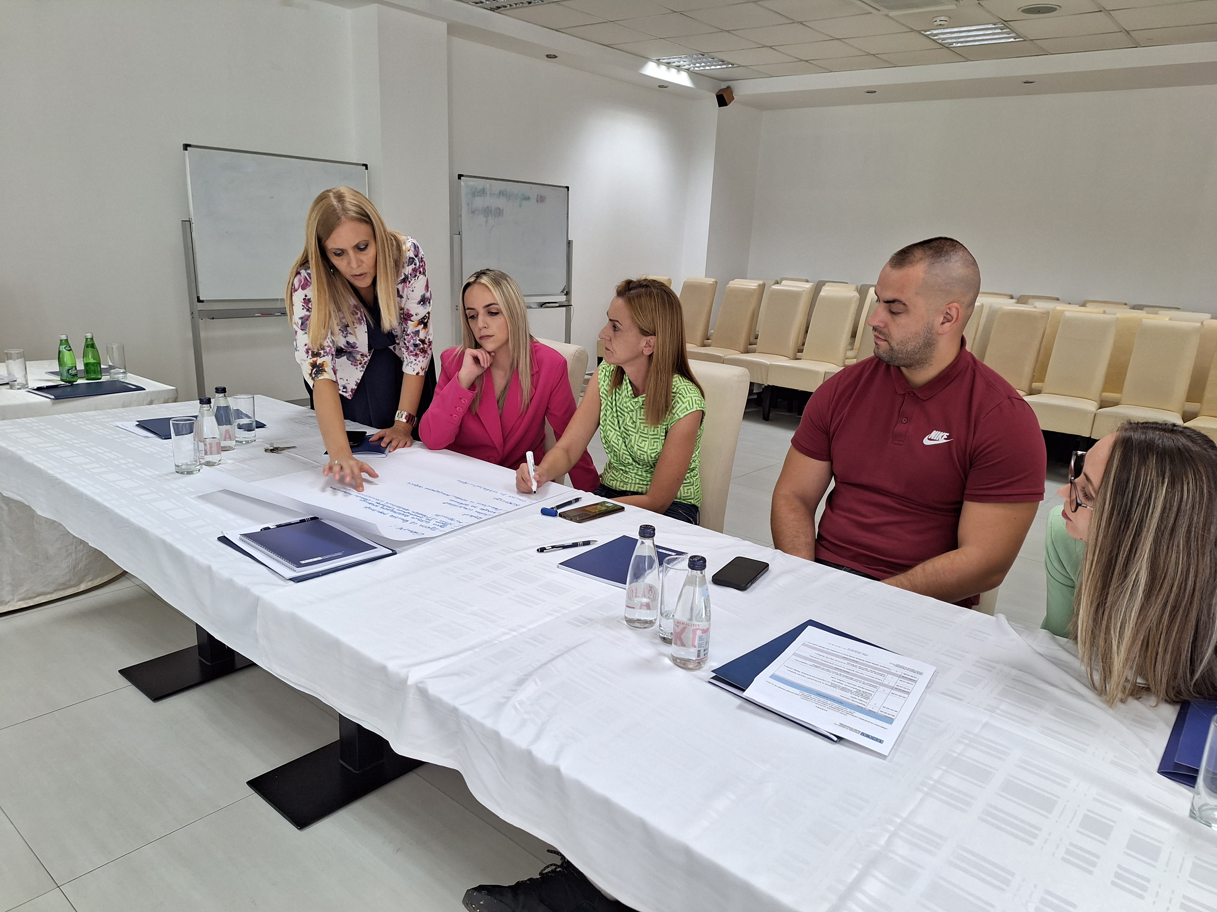 (l) Načelnica Odjeljenja za borbu protiv trgovine ljudima u MUP-u Tijana Šuković razgovara sa policijskim službenicima i službenicama o elementima u procesu intervjuisanja žrtava trgovine ljudima, na radionici koju je organizovao OEBS u Bijelom Polju, Crna Gora, 18. septembra 2023. godine.