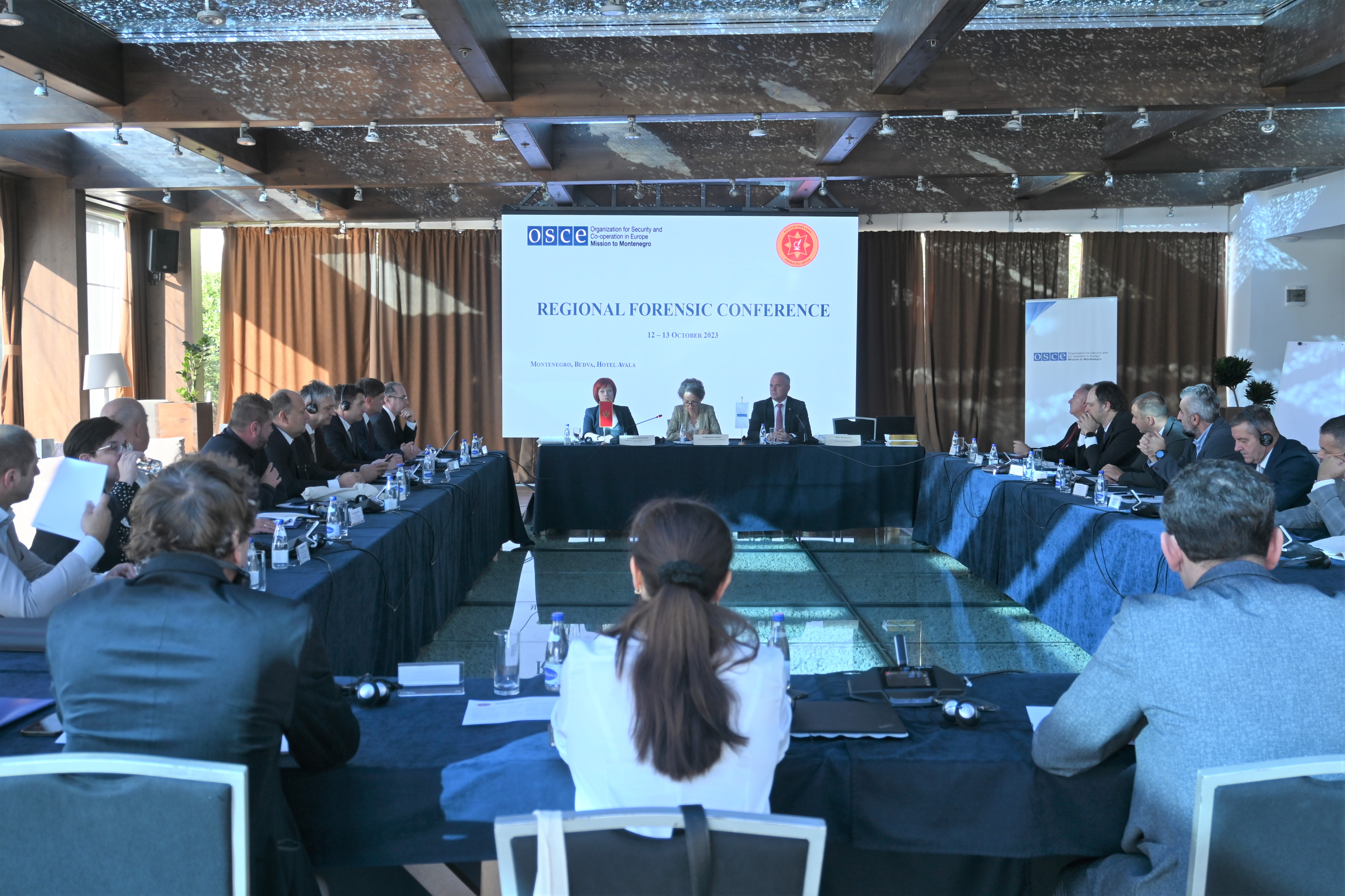 (c) Šefica Misije OEBS-a u Crnoj Gori Dominique Waag, (d) ambasador Republike Sjeverne Makedonije u Crnoj Gori Zećir Ramčilović i (l) direktorica Forenzičkog centra Crne Gore Sandra Kovačević na otvaranju 8. regionalne konferencije forenzičkih centara, organizovane uz podršku Misije, Budva, 12. oktobar 2023. godine.