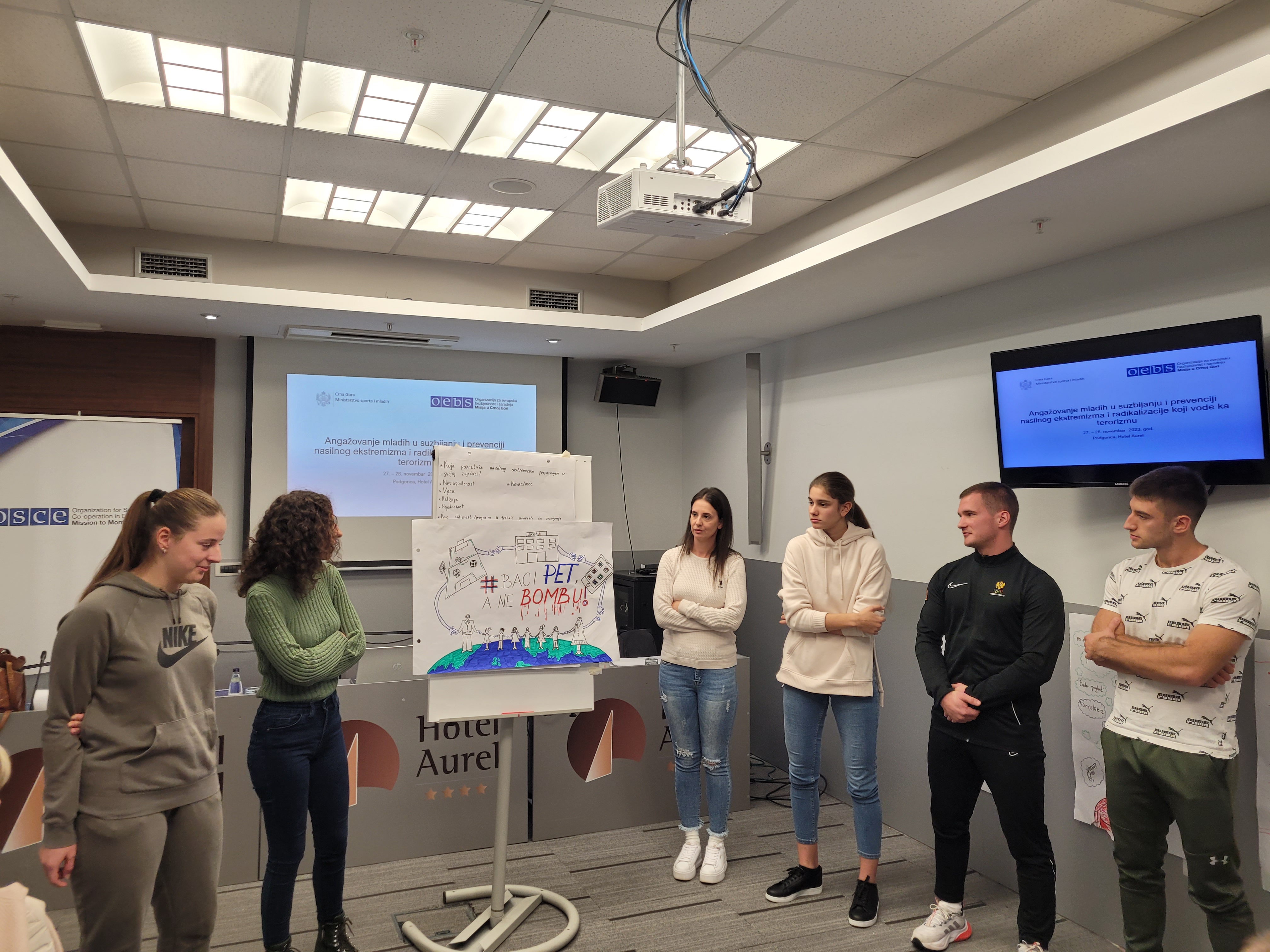 Učesnici i učesnice radionice „Angažovanje mladih u suzbijanju i prevenciji nasilnog ekstremizma i radikalizacije koji vode ka terorizmu“, koju su organizovali Misija OEBS-a u Crnoj Gori i Ministarstvo sporta i mladih, 28. novembar 2023. godine.
