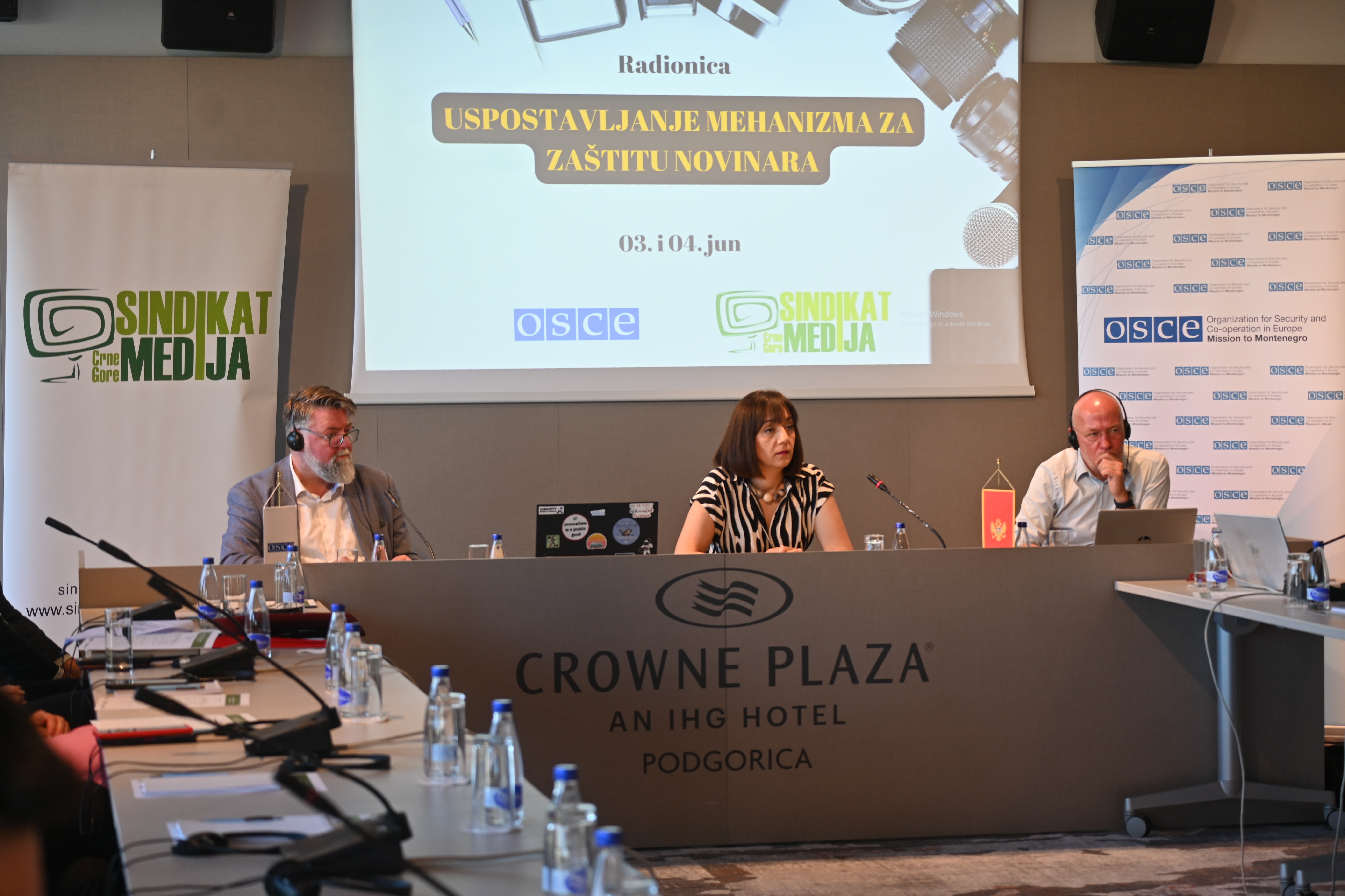 (l-d) Šef Misije OEBS-a u Crnoj Gori Jan Haukaas, potpredsednica Sindikata medija Crne Gore Marijana Camović-Veličković i rukovodilac projekta holandske organizacije PersVeilig Peter ter Velde, na radionici o mehanizmu za bezbjednost medijskih radnika u Podgorici, 3. jun 2025. godine.