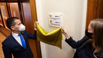 Nakon potpisivanja Sporazuma o donaciji u martu, vršiteljka dužnosti šefa Misije Siv-Katrine Leirtroe i predsjednik Bečić otkrili su danas tablu na ulazu u Crveni salon, kao izraz zahvalnosti prema Misiji na donaciji opreme vrijedne 81.485 €.