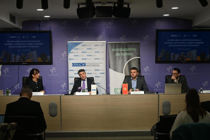 (l-r) Vice President of the Media Trade Union of Montenegro, Marijana Camović-Velicković, Deputy Head of the OSCE Mission to Montenegro, Giovanni Gabassi, Media Trade Union President, Radomir Kračković, and Defacto Consultancy’s researcher Slaven Živković, at the presentation of the Research on the socio-economic status of journalists and other media professionals in Montenegro, 23 January 2026.