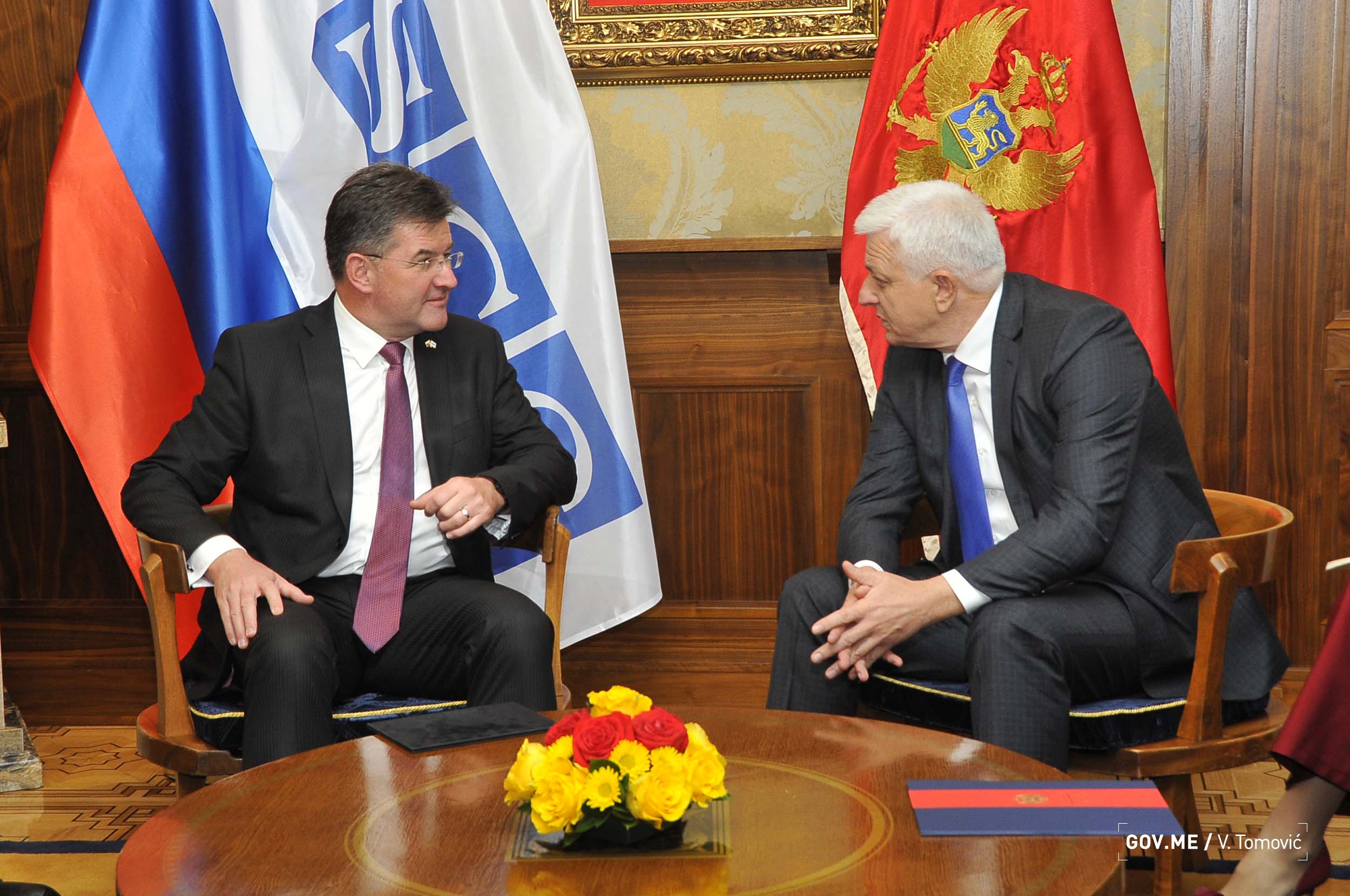 OSCE Chairperson-in-Office and Slovakia’s Foreign and European Affairs Minister Miroslav Lajčák (l) and Prime Minister of Montenegro Duško Marković meet in Podgorica, 8 May 2019.