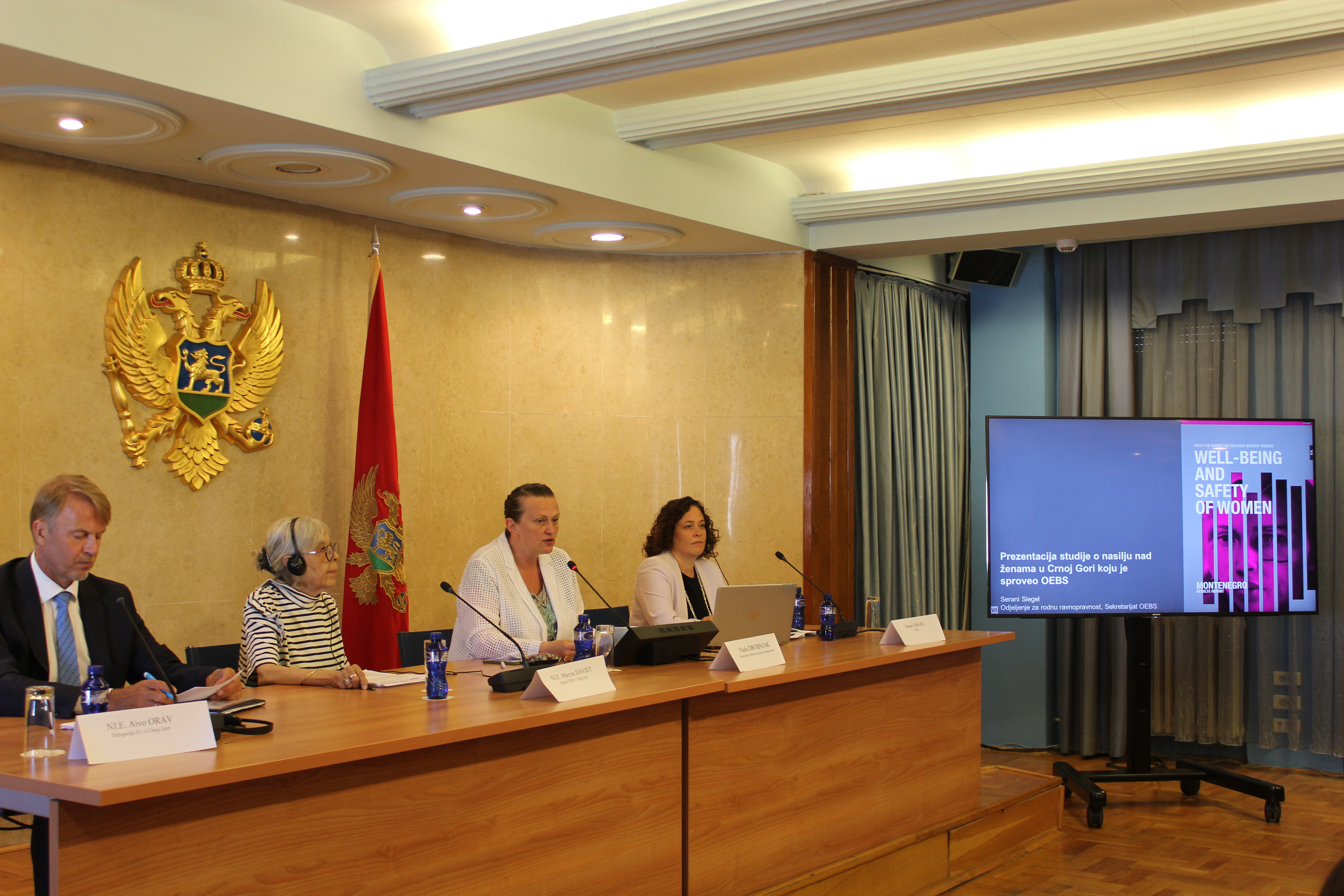 (l-r) Aivo Orav, Head of the EU Delegation to Montenegro, Maryse Daviet, Head of the OSCE Mission to Montenegro, Nada Drobnjak, President of the Committee for Gender Equality of the Parliament of Montenegro and Serani Siegel, Project Manager in the Gender Section of the Office of the OSCE Secretary General speaking at the presentation of the OSCE-led Survey on the Well-being and Safety of Women in Montenegro, Podgorica, 8 July 2019.
