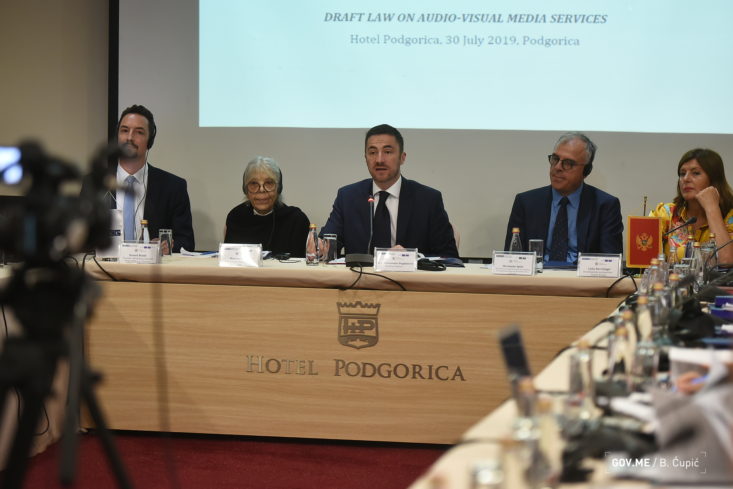 (l-r) Daniel Blank, Media Programme Manager at the OSCE Mission to Montenegro, Maryse Daviet, Head of the OSCE Mission to Montenegro, Aleksandar Bogdanović, Minister of Culture,Hermann Spitz, Head of the Co-operation Section at the EU Delegation to Montenegro and Lejla Dervišagić, Co-ordinator for the expertise of the Council of Europe opening the round table discussion on the proposal for the Law on Audio-Visual Media Services in Podgorica, 30 July 2019.