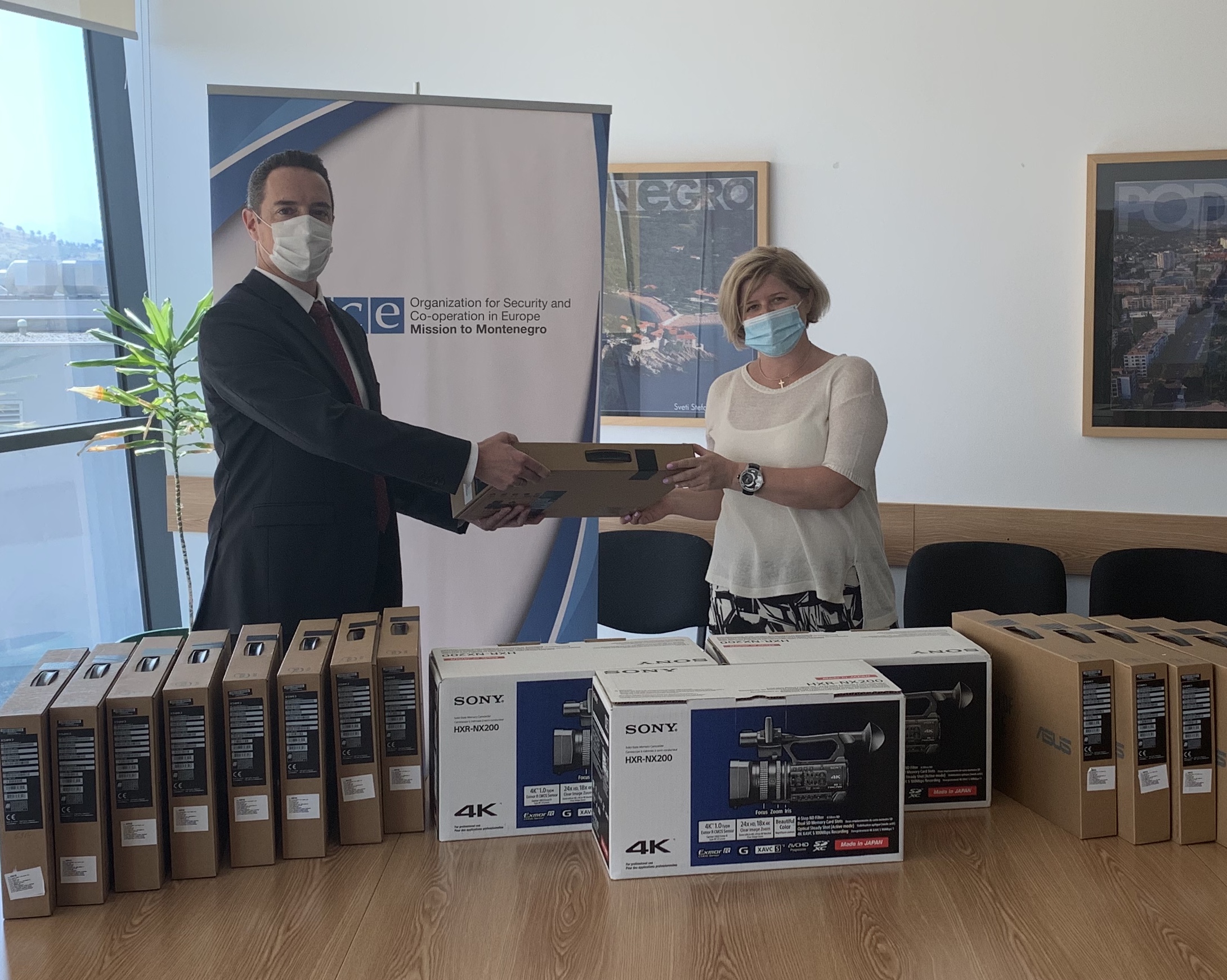Daniel Blank, Media Programme Manager at the OSCE Mission to Montenegro hands over 21 laptops and three professional cameras to Nataša Ružić, Professor at the Faculty of Political Sciences’ Journalism Department in Podgorica, on 8 September 2020.
