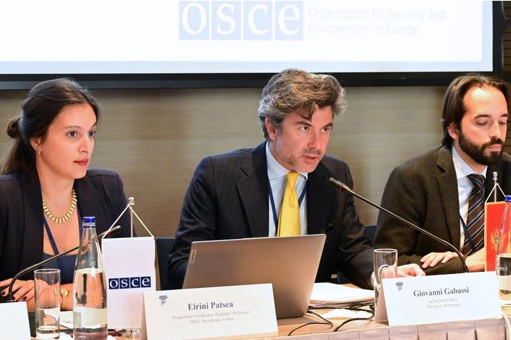 (l-r) Eirini Patsea, OSCE Programme Co-ordinator, Giovanni Gabassi, Acting Head of OSCE Mission to Montenegro and Matteo de Simone, Policy and Programme Officer in DG NEAR, opening the regional conference as part of the OSCE Western Balkans Trial Monitoring Project, Budva, Montenegro, 26 September 2024.