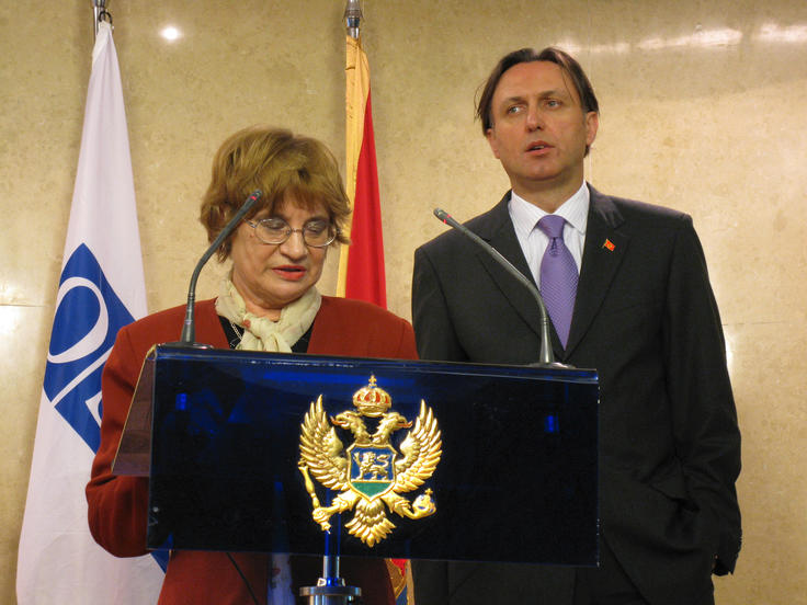 Head of the OSCE Mission to Montenegro, Amb. Paraschiva Badescu (left) and the Speaker of Parliament, Ranko Krivokapic, outline the Mission's support for the Parliament's Library and Research Section, Podgorica, 3 March 2009.