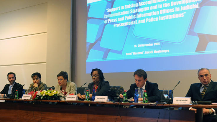 U.S. Ambassador in Montenegro Sue K. Brown; Supreme State Prosecutor Ivica Stankovic; and Interior Minister Rasko Konjevic during a seminar on the importance of public information and outreach in the Judicial, Prosecutorial, and Police institutions organized by the OSCE Mission to Montenegro, Budva, 21 November 2014.