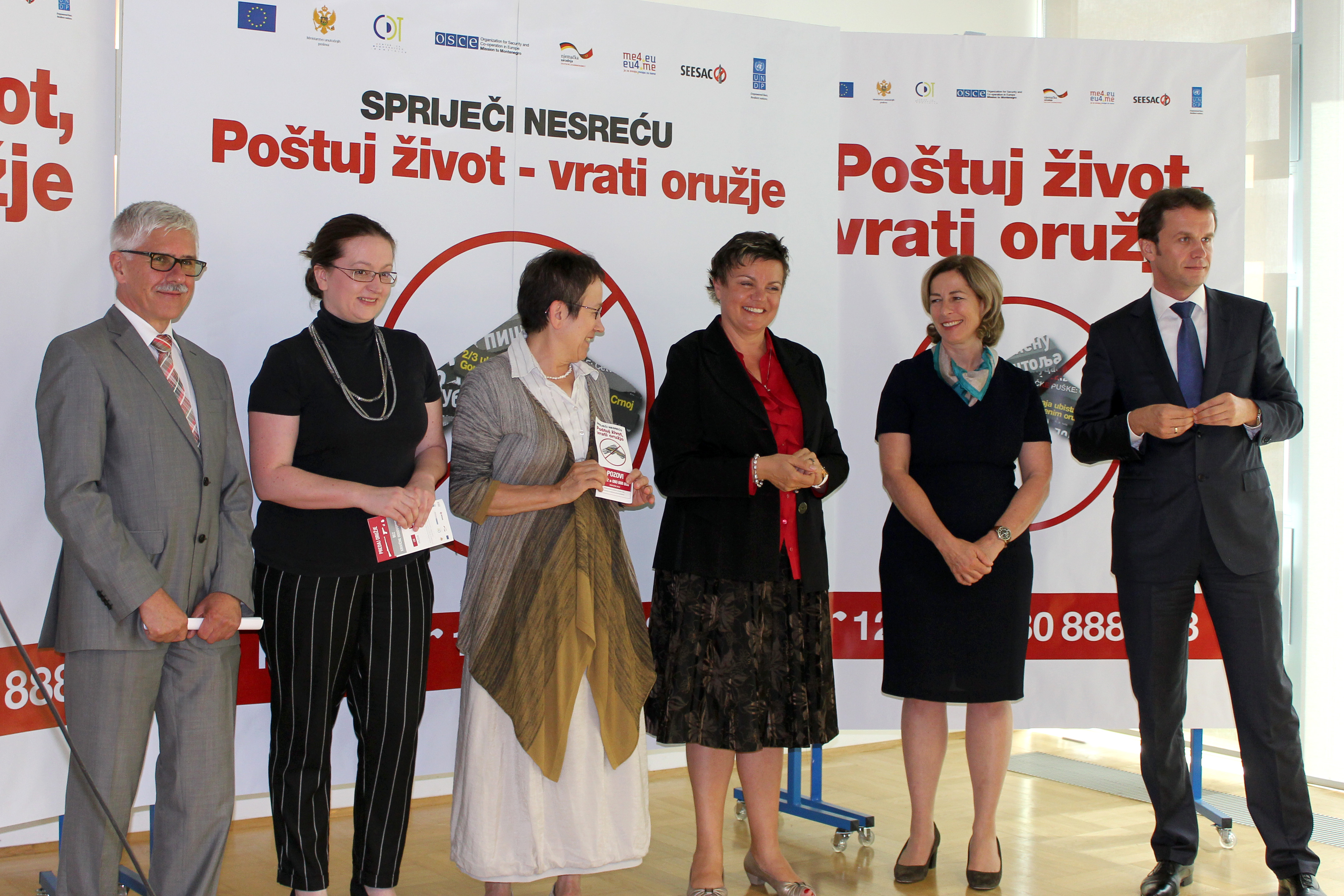 (L-r) Head of EU Delegation in Montenegro, Mitja Drobnic, CDT Director, Milica Kovacevic, German Ambassador to Montenegro Gudrun Elisabeth Steinacker, Head of OSCE Mission to Montenegro, Ambassador Janina Hrebickova, UN Resident Co-ordinator/UNDP Permanent Representative, Fiona McCluney and the Minister of Interior, Rasko Konjevic launch the Small Arms and Light Weapons (SALW) public awareness and illicit weapons collection campaign, Podgorica, 24 June 2015.