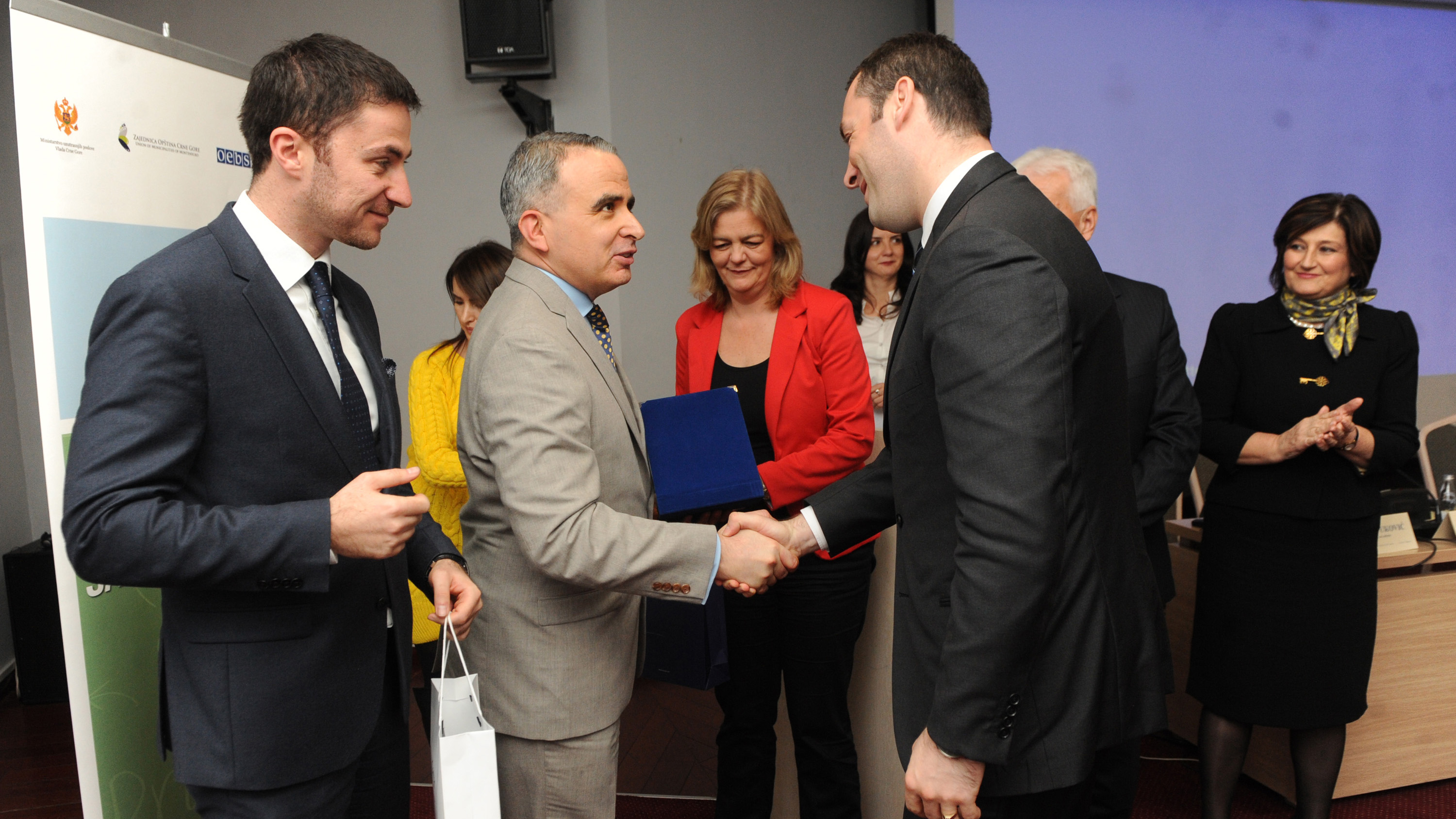 L-r: Mayor of Cetinje Aleksandar Bogdanović, Deputy Head of OSCE Mission to Montenegro Dan Redford and Mayor of Berane Dragoslav Šćekić at the Best Practices Awards ceremony, Podgorica, 28 December 2015.